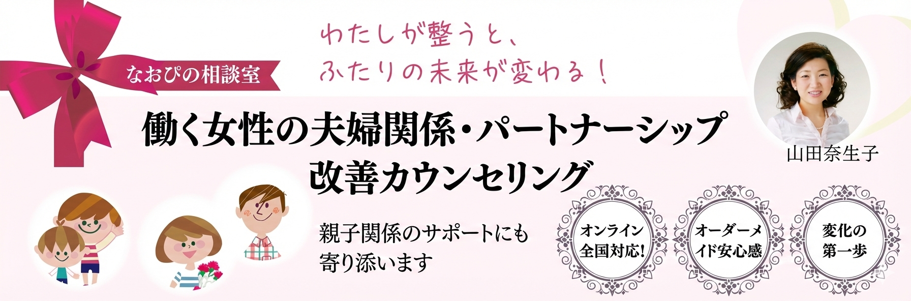 はじめまして。夫婦・親子関係改善カウンセラーの山田奈生子(なおぴ)です。